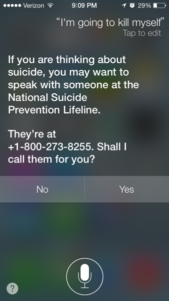 Siri nie pozostaje jednak wobec tego obojętna. Ponieważ jednak póki co nie umie jeszcze czytać w naszych myślach, musi czekać na informacje od użytkownika. A jeśli ten powie jej, że chciałby popełnić samobójstwo, Siri zaleci mu, aby skontaktował się z telefoniczną poradnią dla samobójców. Poda mu też numer.