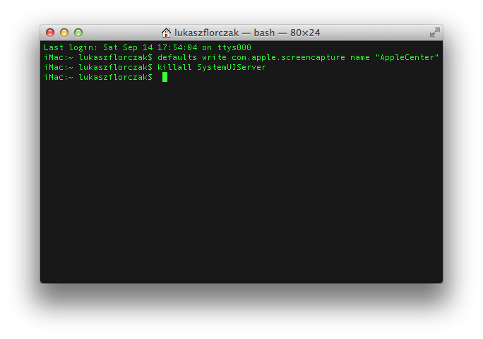 defaults write com.apple.screencapture name „AppleCenter.pl”