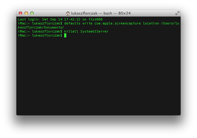defaults write com.apple.screencapture location /Users/lukaszflorczak/Documents/