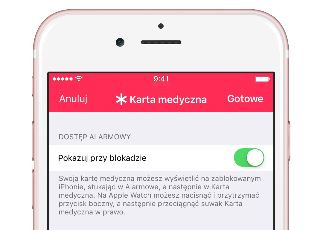Warto też sprawdzić, żeby funkcja Pokazuj przy blokadzie była włączona. Pozwoli ona dostać się do Karty Medycznej nawet z zablokowanego ekranu. Dodatkowo, jeżeli posiadamy Apple Watcha z systemem watchOS 3 to dostęp do karty medycznej jest możliwy po naciśnięciu przycisku bocznego. Stamtąd możemy też (bezpośrednio z zegarka) zadzwonić na numery alarmowe i poinformować kontakty alarmowe, że coś nam się stało.